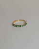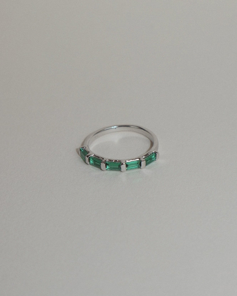 Carefully handcrafted, Evie provides an understated alternative to the classic eternity band. In Evie's case, a row of green cubic zirconia gemstones encircle the first half of the band. Evie's five mini green baguette stones are prong-set into our signature slight molten textured band.
