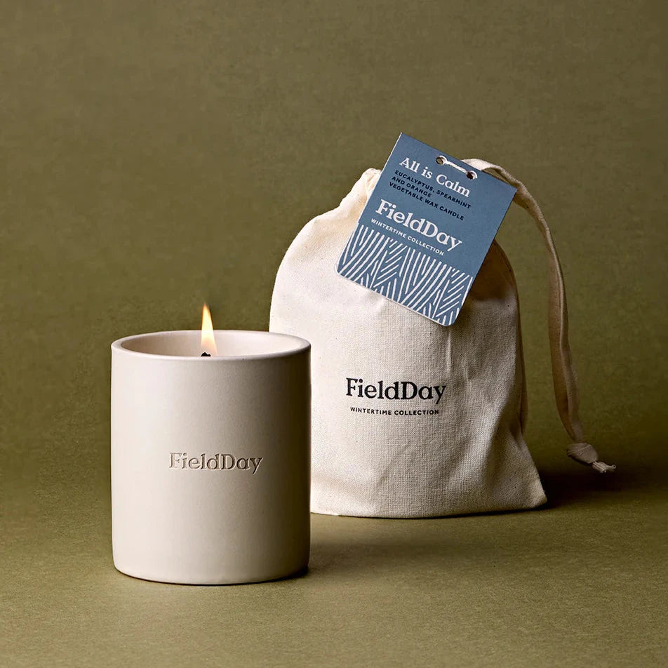 All is Calm Wintertime Candle. Each large candle comes in a branded cotton FieldDay bag, perfect for gifting.