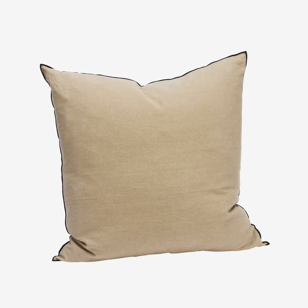 This linen cushion cover, combines 55% linen and 45% cotton for a soft, durable finish. Available in greige and black, its calming solid tones enhance any space. A contrasting border adds a subtle, impactful detail.
