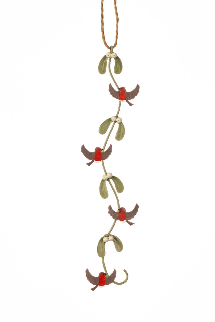 Hanging mistletoe decoration with robins.