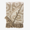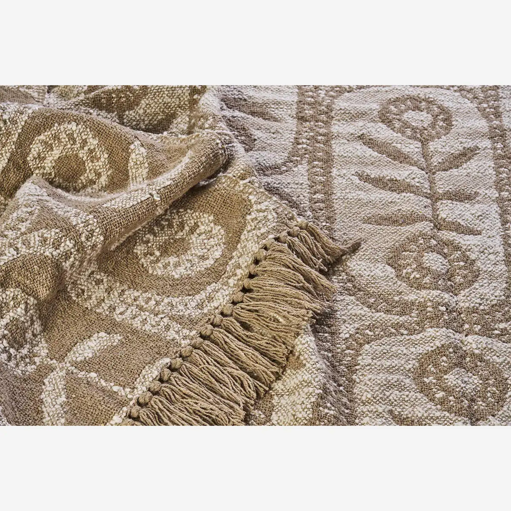 This reversible throw, crafted in India from 100% recycled cotton, showcases a floral pattern inspired by 1950s graphic designs. Handwoven by artisans, its taupe and off-white colors suit any decor, embodying sustainable elegance.