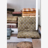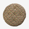 This round cotton chair pad, crafted in India, features a vibrant palette of olive, sand, old rose, and mustard inspired by traditional Indian block prints. It fits most chairs, adding comfort and color to any seating arrangement.